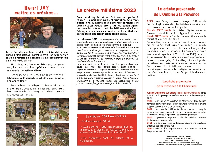 de Christophoros : « Il faut dire que cette année on a mis le paquet. On, c’est bien évidemment celui sans qui notre crèche serait seulement banale : Henri Jay dont il faut calculer le temps de travail en mois ; il a plus que doublé le monument avec de magnifiques créations. (…) On, c’est aussi Frédéric Loridon ; il a largement contribué à l’électrification de la crèche qui impressionne beaucoup les visiteurs ». D’autres membres de l’association prêtent leur savoir-faire à Henri : Louis Gradelet très régulièrement ; Emile Baffert, David Benedetti à l’occasion.